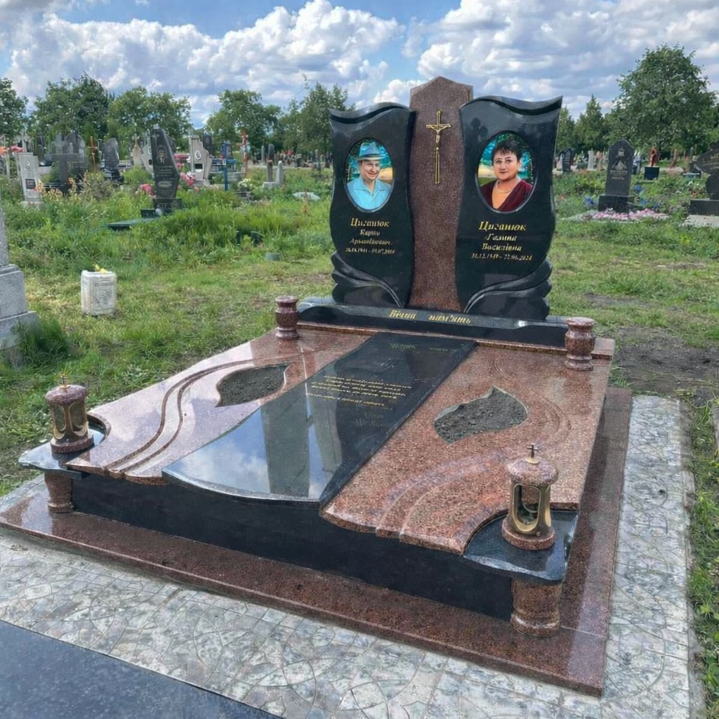 Памятник на могилу из гранита — это семейный мемориал, рассчитанный на два места захоронения. Такая композиция помогает оформить участок аккуратно и сохранить общую память о близких. Конструкция объединяет две портретные стелы и центральный элемент с крестом, благодаря чему надгробный памятник выглядит цельно и спокойно вписывается в пространство кладбища.