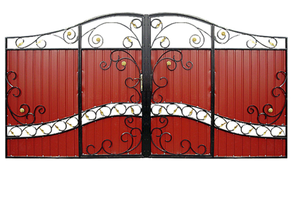 | — калитка в правой или левой части ворот — скоба для навесного замка — засов на соединение ворот — грунтованные и окрашенные — ручка на открытие и закрытие — механизм с ключами |