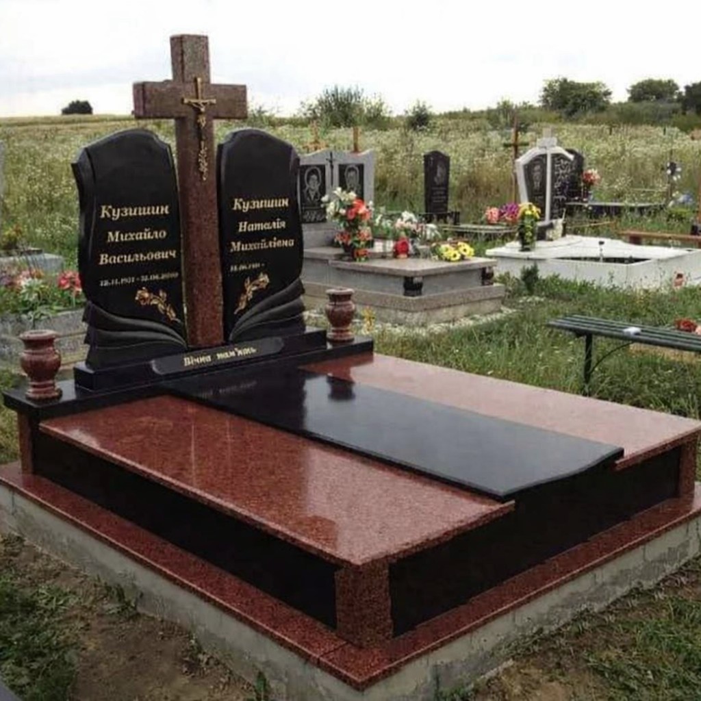 Основой конструкции является гранит — прочный природный камень, устойчивый к погодным условиям. Материал хорошо переносит дождь, мороз, перепады температуры и солнечное воздействие. Благодаря полированной поверхности могильный памятник долго сохраняет аккуратный внешний вид, а ритуальный монумент остаётся устойчивым и долговечным на протяжении многих лет.