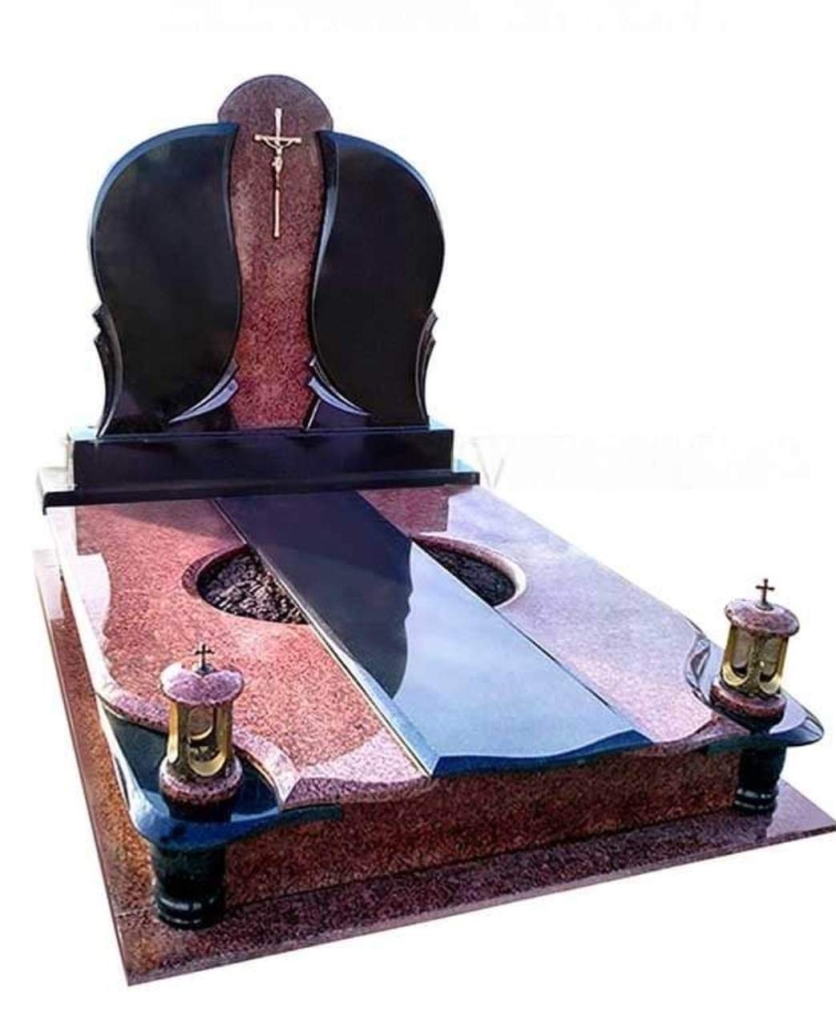 Внешне надгробный памятник отличается симметричной формой и спокойной архитектурой. Две стелы создают гармоничный силуэт, а центральная часть с крестом усиливает духовный смысл композиции. Контраст темного и красного гранита делает надгробие выразительным, но при этом сдержанным. Такое решение хорошо вписывается в пространство кладбища и сохраняет аккуратный вид даже спустя годы.