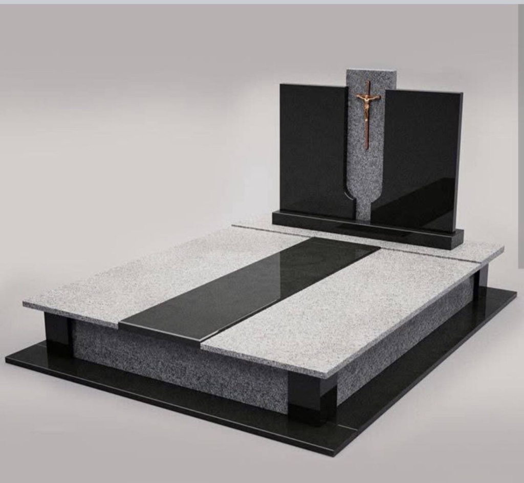 Внешний вид построен на контрасте двух оттенков камня. Черный полированный гранит подчеркивает геометрию конструкции, а серый гранит делает композицию более спокойной и выразительной. Центральная часть со встроенным крестом формирует вертикальный акцент, поэтому надгробный памятник воспринимается как полноценный мемориальный монумент, уместный для пространства похорон и семейной гробницы.