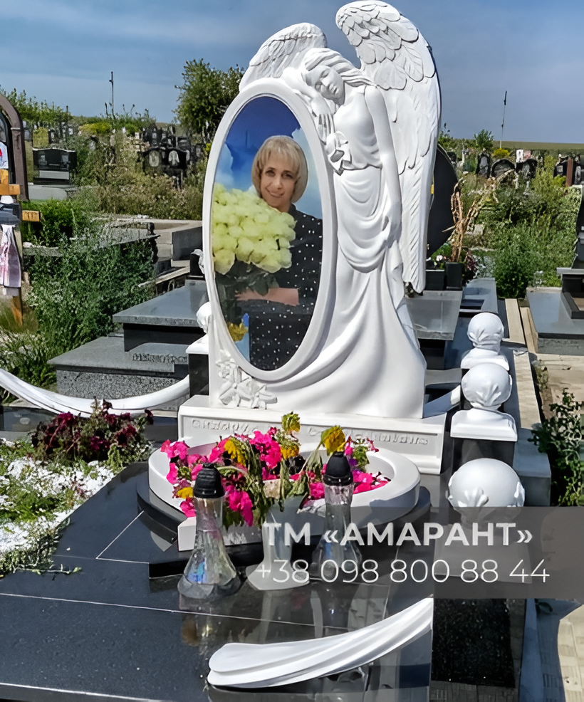 Изделие выполнено в эксклюзивной форме — вертикальная стела в обрамлении скульптурного ангела, с нежным наклоном головы и закрытыми глазами. Белоснежный ангел символизирует покой, охрану и заботу, создавая визуальный центр всей композиции. Портрет, выполненный в формате фотоовал, отпечатан на высококачественной фотокерамике, устойчивой к УФ-излучению, влаге и перепадам температур.
