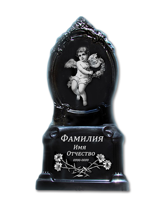 Надгробный памятник выполнен с плавными линиями и вертикальной композицией. Центральное изображение ангела добавляет смысл и делает надгробие более личным. Тёмная поверхность контрастирует с декоративными элементами, благодаря чему монумент выглядит выразительно без перегрузки деталями.
