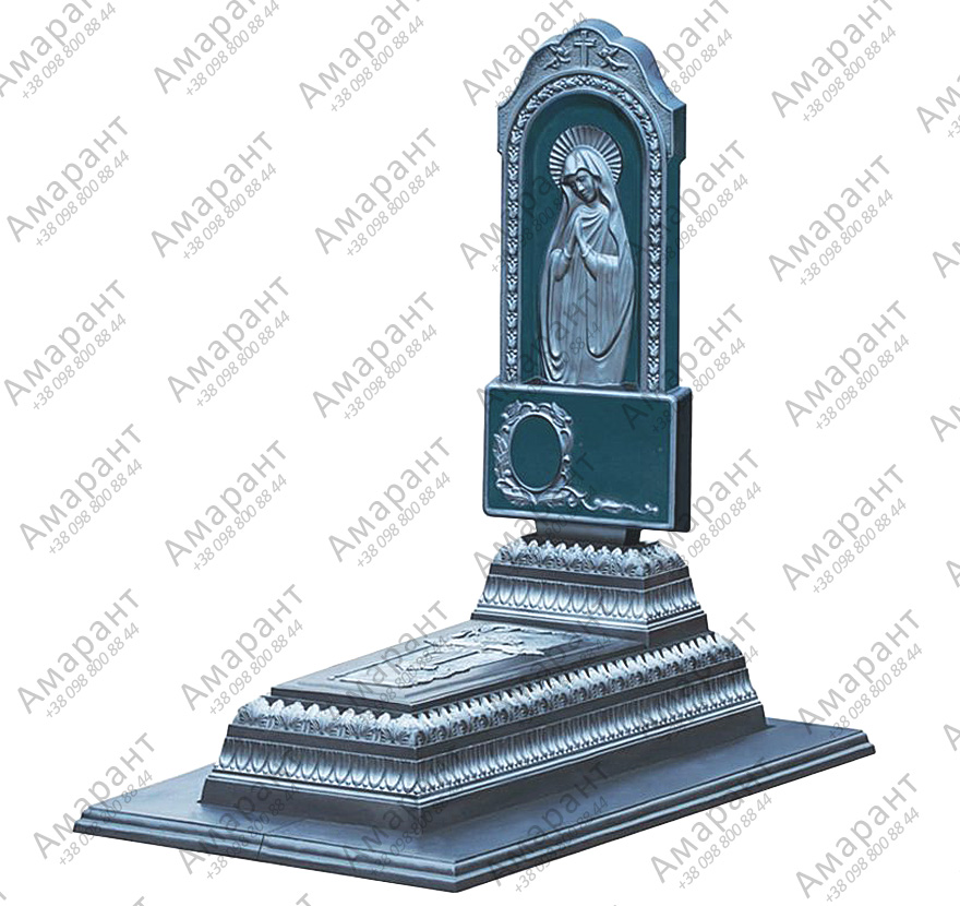 Композиция выполнена в виде вертикальной стелы с образом Матери Божьей и устойчивого основания. Графитовый оттенок придает надгробию глубину и строгий характер, благодаря чему оно гармонично смотрится на кладбище как отдельный монумент или как часть оформленной гробницы.
