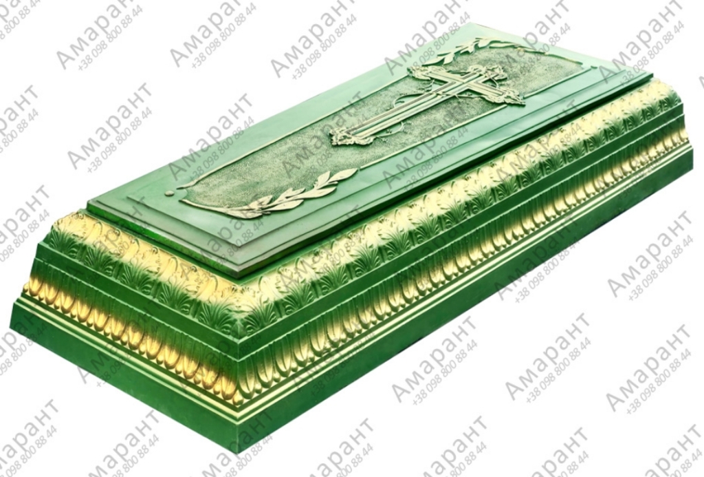 Зеленый бетонный надгробок с крестом и орнаментом
