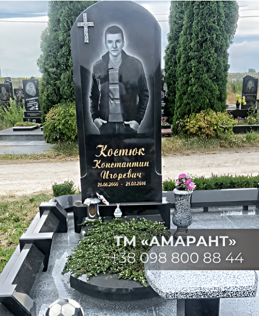 Изделие устанавливается на фундамент с плиткой, оформлено аккуратной обрамляющей конструкцией и украшено вазонами, элементами в виде футбольного мяча и фонариками. Такая композиция особенно подходит для увековечения памяти молодого человека, подчеркивая его интересы и индивидуальность.