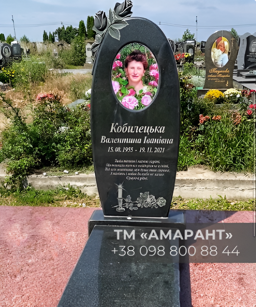 Памятник АМАРАНТ с фотоовалом и металлическими розами — достойное решение для вечной памяти, созданное с уважением и вниманием к каждой детали.