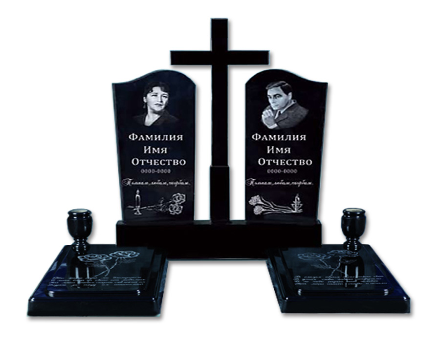 Двойная конструкция позволяет оформить общее мемориальное пространство для близких людей, а центральный крест подчеркивает символику и придает композиции завершенный вид.