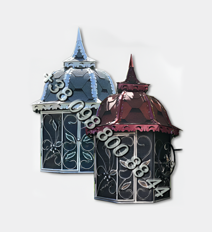 Конструкция выполнена из металла с коваными элементами и воспринимается как ландшафтный декор, а не только защитный элемент. Такая крыша на колодец органично смотрится возле дома, в саду или на даче, добавляя участку завершённый вид без лишней перегруженности.