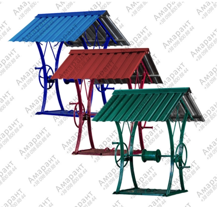 Конструкция имеет выразительный внешний вид: изогнутые металлические стойки, ручку в стиле классического воротка и крышу из профнастила. Благодаря этому изделие воспринимается не как сугубо техническое накрытие, а как декоративный элемент участка. Оно хорошо сочетается с садовыми дорожками, клумбами, фасадом дома и другими деталями благоустройства. Такой верх уместен там, где важно не только пользоваться колодцем, но и сохранить общее впечатление от двора.