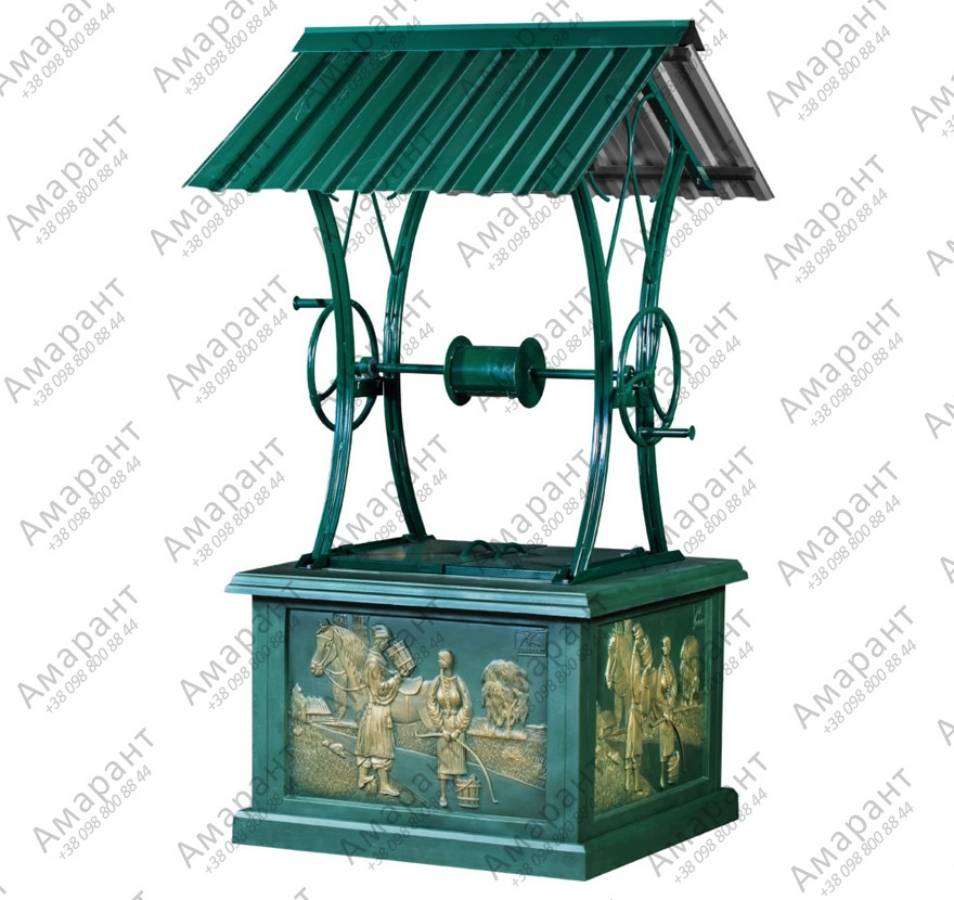 Модель выполнена из металла, окрашена в зелёный цвет с золотистыми вставками и дополнена барельефами с народными мотивами. Такое оформление колодца гармонично смотрится во дворе, саду или на территории загородного дома и воспринимается как полноценный ландшафтный декор.