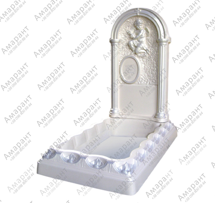 Надгробний пам’ятник виконаний у класичній арковій формі з барельєфом ангела, що передає спокійну скорботу. Декоративна рамка в основі формує завершений вигляд і акуратно виділяє зону гробниці. Такий формат добре вписується в традиційне оформлення ділянки.