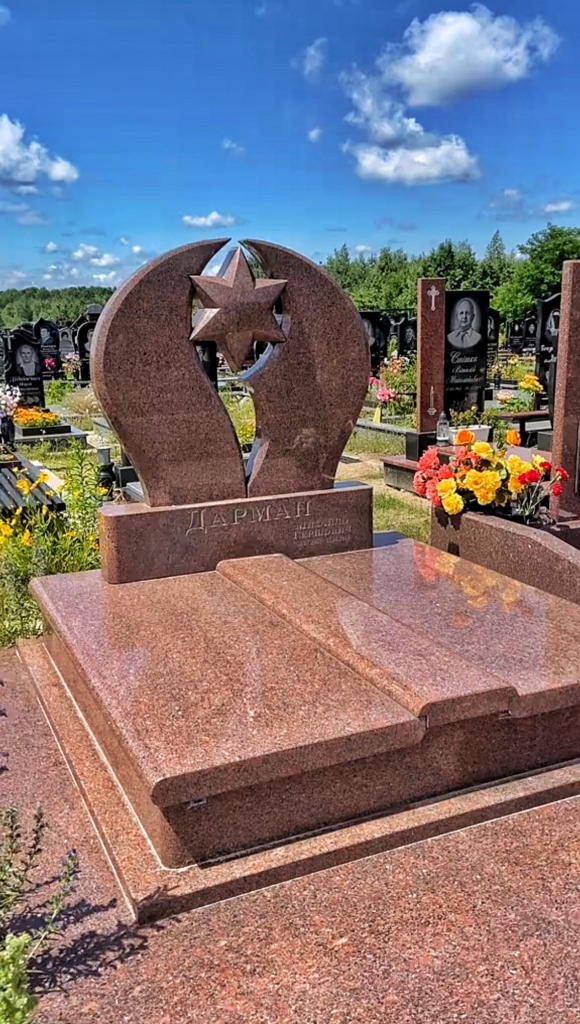 Пам’ятник на могилу з червоного граніту з мусульманською символікою — це надгробний пам’ятник, призначений для оформлення подвійного поховання та збереження пам’яті про близьких людей. Така композиція допомагає акуратно позначити гробницю та створити єдиний меморіальний простір на кладовищі. Надгробок виглядає стримано й гідно, підкреслюючи традиційний ритуальний характер оформлення місця поховання.