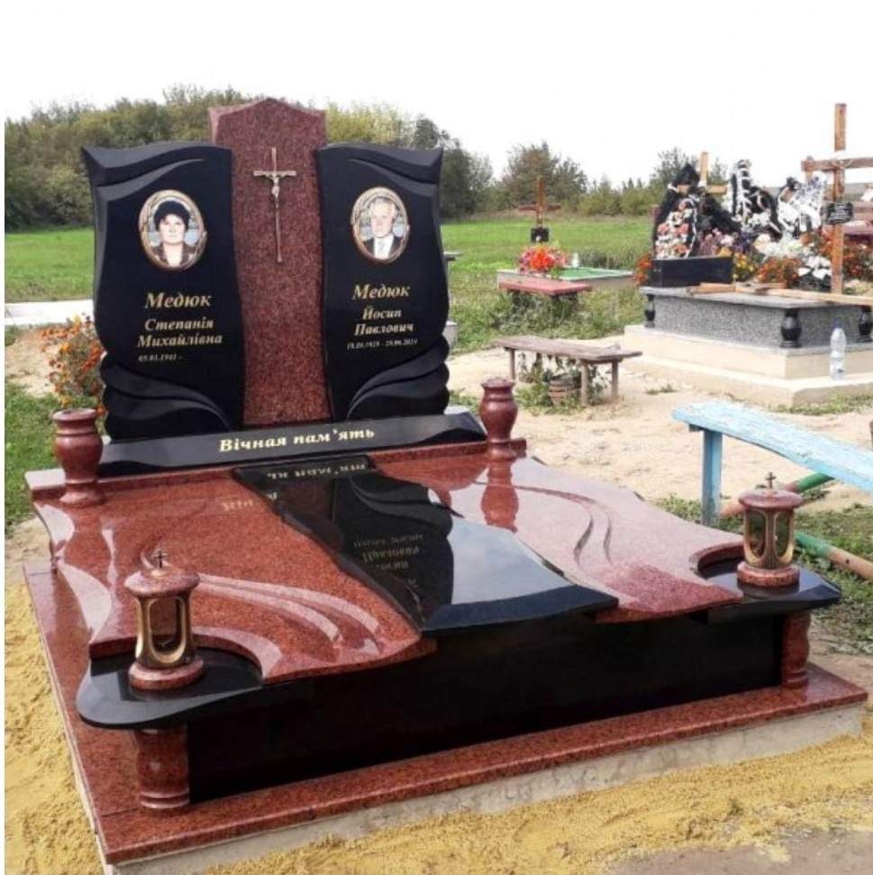 Композиція виконана з поєднання червоного та чорного граніту. Центральну частину підкреслює вертикальна плита з хрестом, а з боків розміщені стели для портретів і написів. Контраст каменю робить монумент виразним, але водночас стриманим. Таке надгроб’я добре виглядає на ділянці кладовища та дозволяє оформити місце похорон акуратно й завершено.