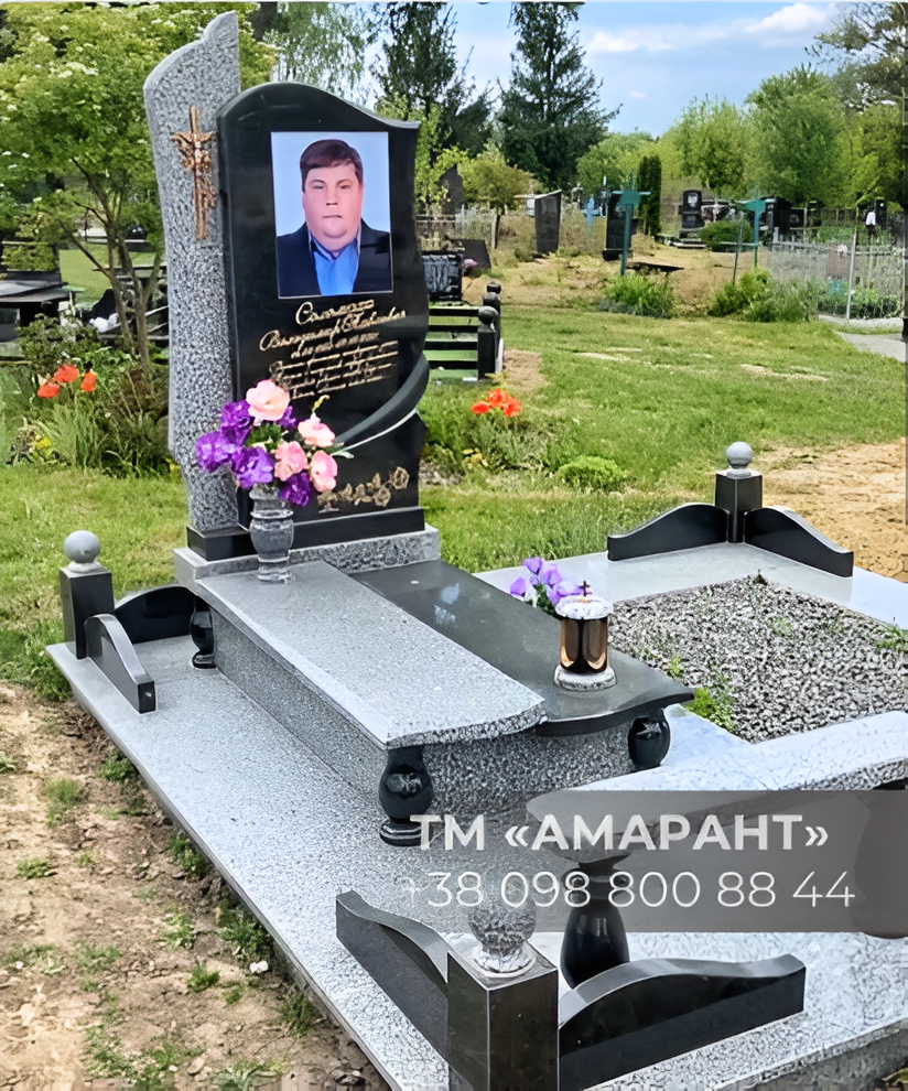 Пам’ятник гранітний АМАРАНТ з фотокерамікою та художнім гравіюванням – гармонійне поєднання строгості, індивідуальності та міцності. Центральний акцент – кольорова фотокераміка, вставлена в основну плиту із габро. Завдяки сучасній технології нанесення зображення стійке до вицвітання, вологи та морозу. Воно зберігає чіткість та насиченість десятиліттями. Композиція доповнена декоративним православним хрестом та різьбленою хвилеподібною формою, що надає пам’ятнику легку динаміку.