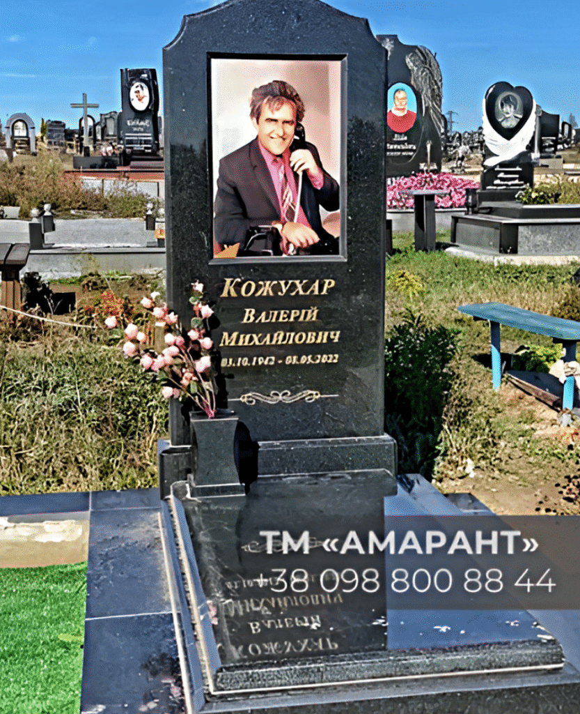 Пам’ятник гранітний АМАРАНТ, представлений на фото, поєднує у собі класичну форму та сучасні елементи оформлення. Він виготовлений із зносостійкого чорного габро – одного з найміцніших і найдовговічніших видів граніту, що широко застосовуються в меморіальній архітектурі. Основна прикраса пам’ятника – фотокераміка на склі з портретом на повний зріст, що передає індивідуальність людини, що пішла.