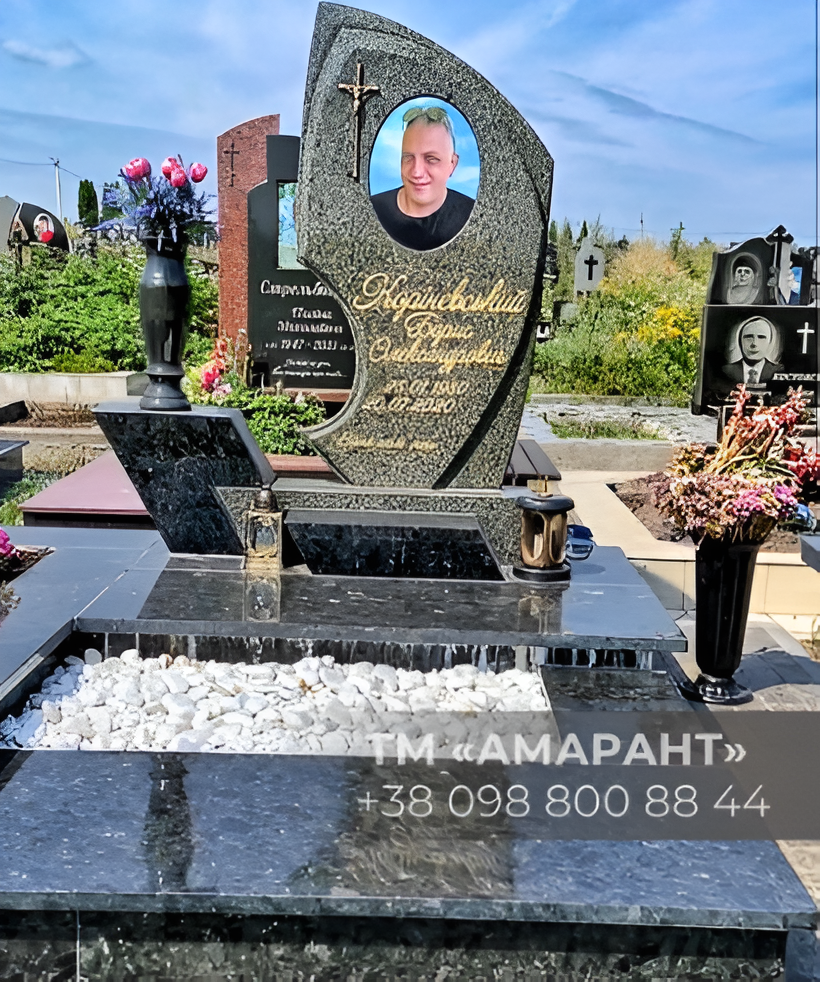 Пам’ятник гранітний АМАРАНТ з фотоовалом – це зразок сучасної меморіальної архітектури, що поєднує художню виразність та технічну досконалість. Його асиметрична форма з плавними лініями та декоративною виїмкою створює враження індивідуального підходу, виділяючи цю пам’ятку на тлі типових рішень. Вбудований фотоовал із кольоровим портретом, оформлений на міцній основі, надійно захищений від впливу навколишнього середовища та зберігає чіткість зображення на десятиліття.