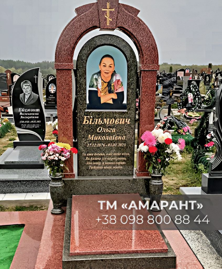 Пам’ятник гранітний АМАРАНТ на фото – це гідне рішення для увічнення пам’яті близької людини. Представлена модель поєднує шляхетну форму арки з хрестом, високу зносостійкість та виразне оформлення з фотокерамікою на фронтальній плиті. Такий надгробок підкреслює індивідуальність, дбайливо зберігаючи вигляд і гідність того, хто пішов.