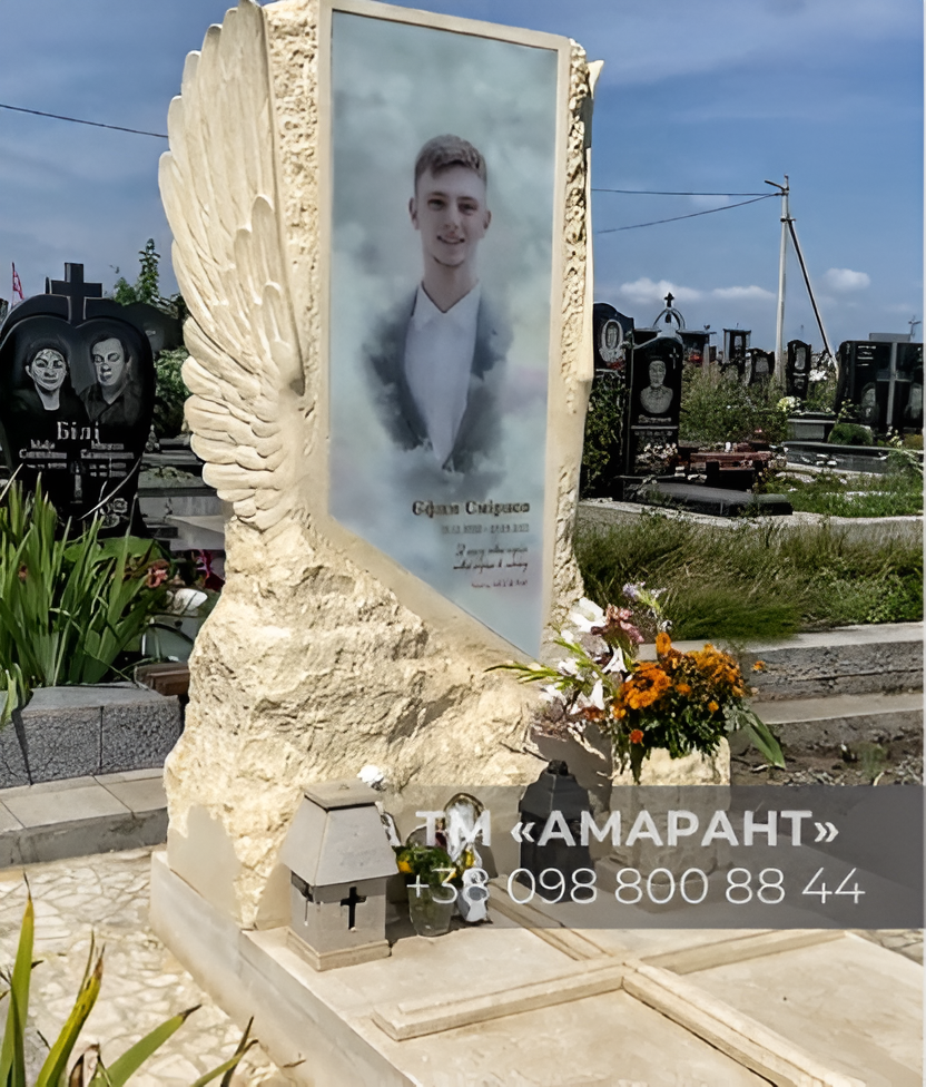 Пам’ятник гранітний АМАРАНТ з фото на склі та різьбленням у вигляді ангельських крил — це не просто надгробок, а твір меморіального мистецтва, наповнений світлом та благородством. Ефектний вертикальний моноліт виконаний у світлому кольорі та імітує текстуру природного каменю, зберігаючи при цьому строгу геометрію та символізм. Крила, вирізані вручну, символізують небесний захист і піднімають композицію рівня художнього меморіалу.