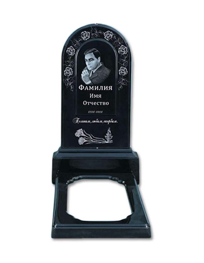 Матеріал — полімерграніт, який стійкий до вологи, морозу та сонячного впливу. Такий могильний пам’ятник не потребує складного догляду та зберігає зовнішній вигляд при тривалій експлуатації, що робить його практичним рішенням для встановлення на відкритому повітрі.