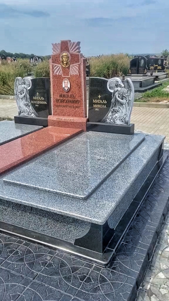 Подвійний пам’ятник з граніту з хрестом та ангелами